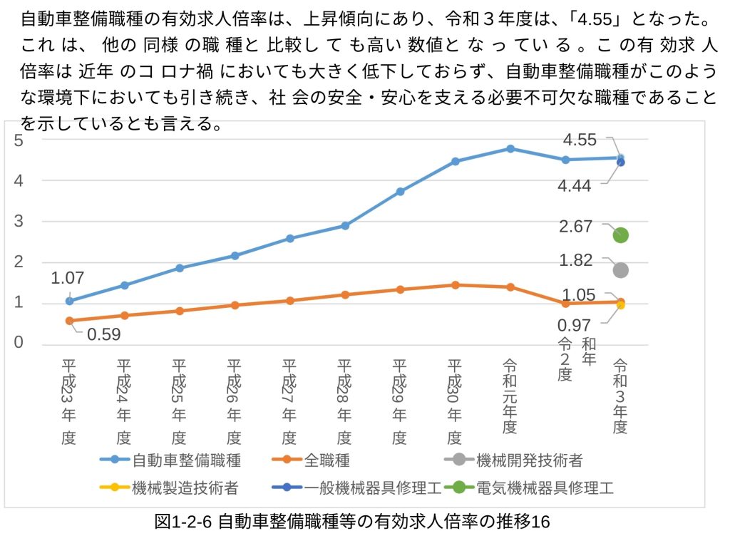 日本自動車整備振興会連合会(JASPA)の報告によると、整備士の有効求人倍率は全国平均を上回るペースで推移しているとのことです。